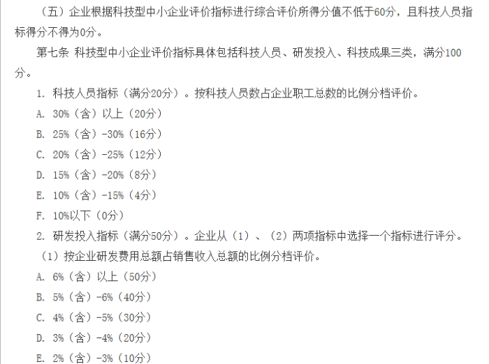 5.企業(yè)根據(jù)科技型中小企業(yè)評價指標進行綜合評價所得分值不低于60分,且科技人員指標得分不得為0分。