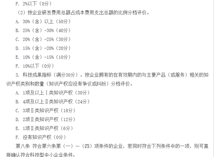 3.科技成果指標(滿分30分)。按企業(yè)擁有的在有效期內(nèi)的與主要產(chǎn)品(或服務(wù))相關(guān)的知識產(chǎn)權(quán)類別和數(shù)量(知識產(chǎn)權(quán)應(yīng)沒有爭議或糾紛)分檔評價。