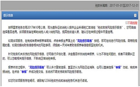 1、 您在申報(bào)頁(yè)面點(diǎn)擊“所得稅年度A類申報(bào)”后,系統(tǒng)將給出風(fēng)險(xiǎn)提示服務(wù)相關(guān)提示語(yǔ)。