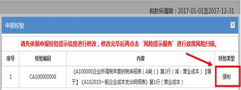 4、點(diǎn)擊*三步提示框中的“確定”按鈕后如果跳出申報(bào)強(qiáng)制校驗(yàn)信息,請(qǐng)您先依據(jù)申報(bào)校驗(yàn)提示信息進(jìn)行修改,修改完畢后可再次點(diǎn)擊“風(fēng)險(xiǎn)提示服務(wù)”,系統(tǒng)將為您進(jìn)行政策風(fēng)險(xiǎn)掃描。