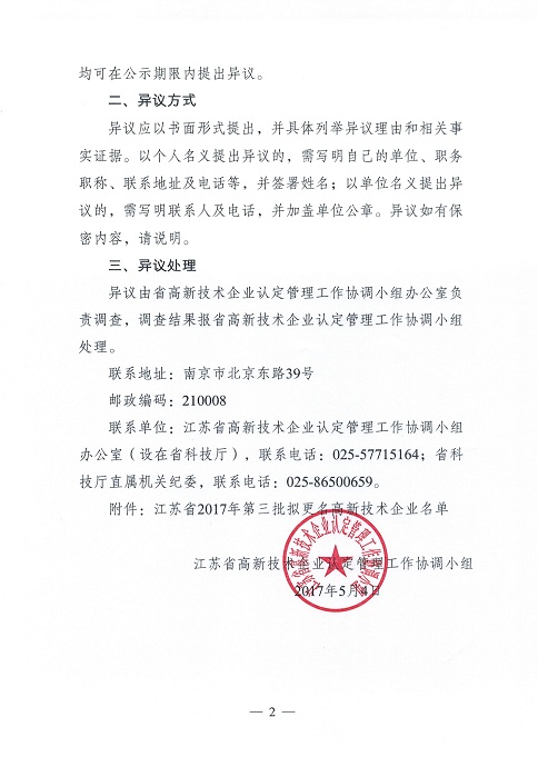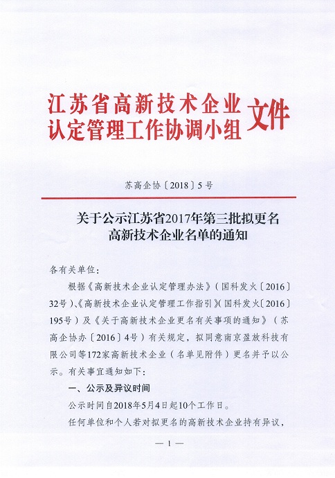 2017年江蘇省*三批擬更名高新技術企業名單的通知