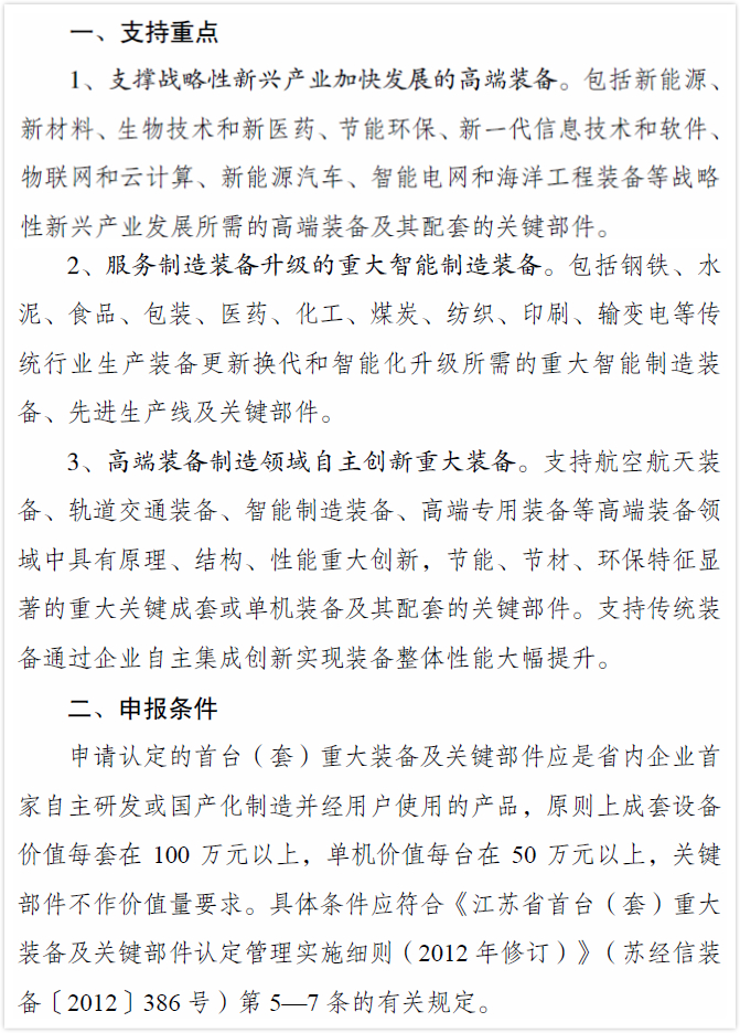 2、申報首臺(套)重大裝備及關鍵部件示范應用項目必須提前完成江蘇省首臺(套)重大裝備及關鍵部件認定工作;
