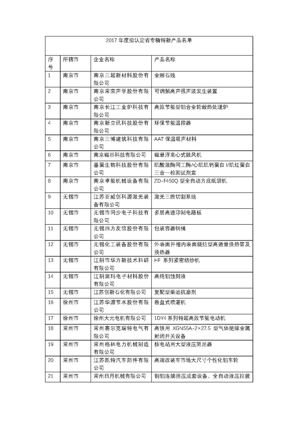 關于2017年度江蘇省科技小巨人企業和專精特新產品擬認定名單的公示