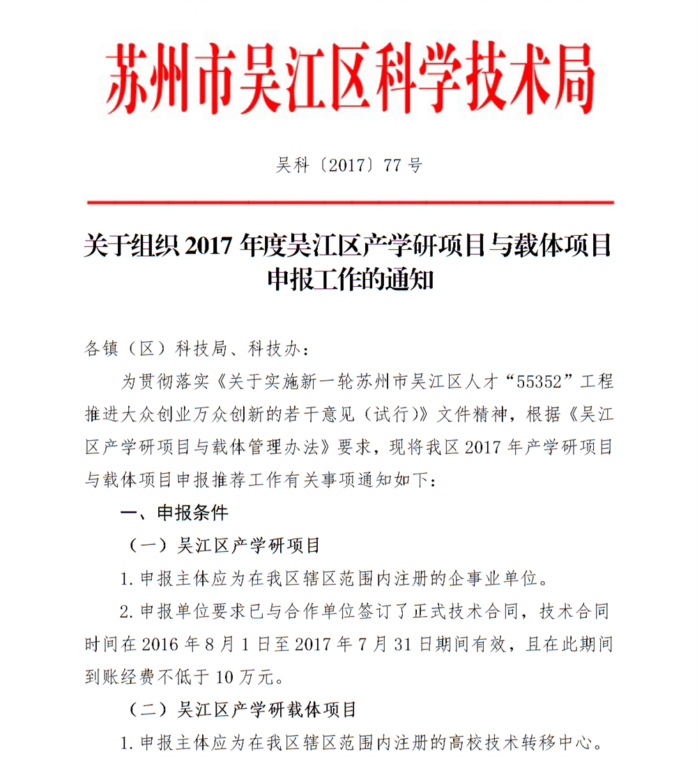 2017年度吳江區產學研項目與載體項目咨詢工作的通知