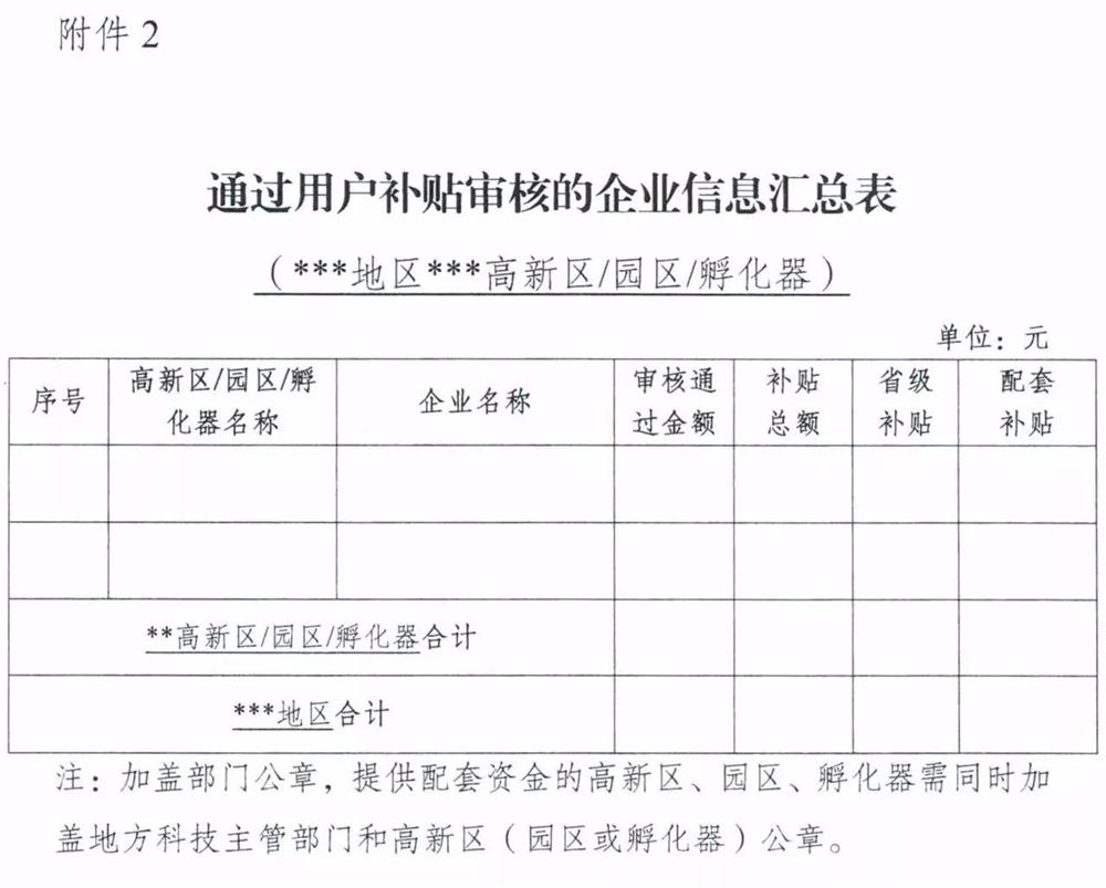 4、請地方科技主管部門、高新區(qū)、園區(qū)、孵化器于11月30日前完成區(qū)域內(nèi)企業(yè)的申報(bào)材料審核工作,報(bào)送區(qū)域內(nèi)通過用戶補(bǔ)貼審核的企業(yè)信息匯總表(加蓋部門公章)。提供配套資金的高新區(qū)、園區(qū)、孵化器需同時(shí)加蓋地方科技主管部門和高新區(qū)(園區(qū)或孵化器)公章。